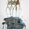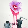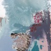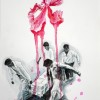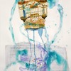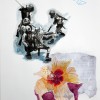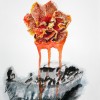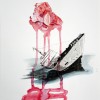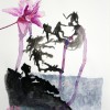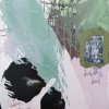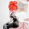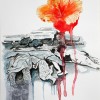 His mixed media works on paper combine flora, newspaper reportage, finely drawn birdcages, boats, and calligraphy all linked with ribbons of coloured wash. These are then translated into larger scale works on canvas. Using poured enamel paint in lieu of watercolour he expands the scale and impact of his recent work. Floating over aerosol acrylic painted backgrounds with vibrant gloss enamel colour, he creates flowers from each country’s iconic bloom, using a marbling technique.