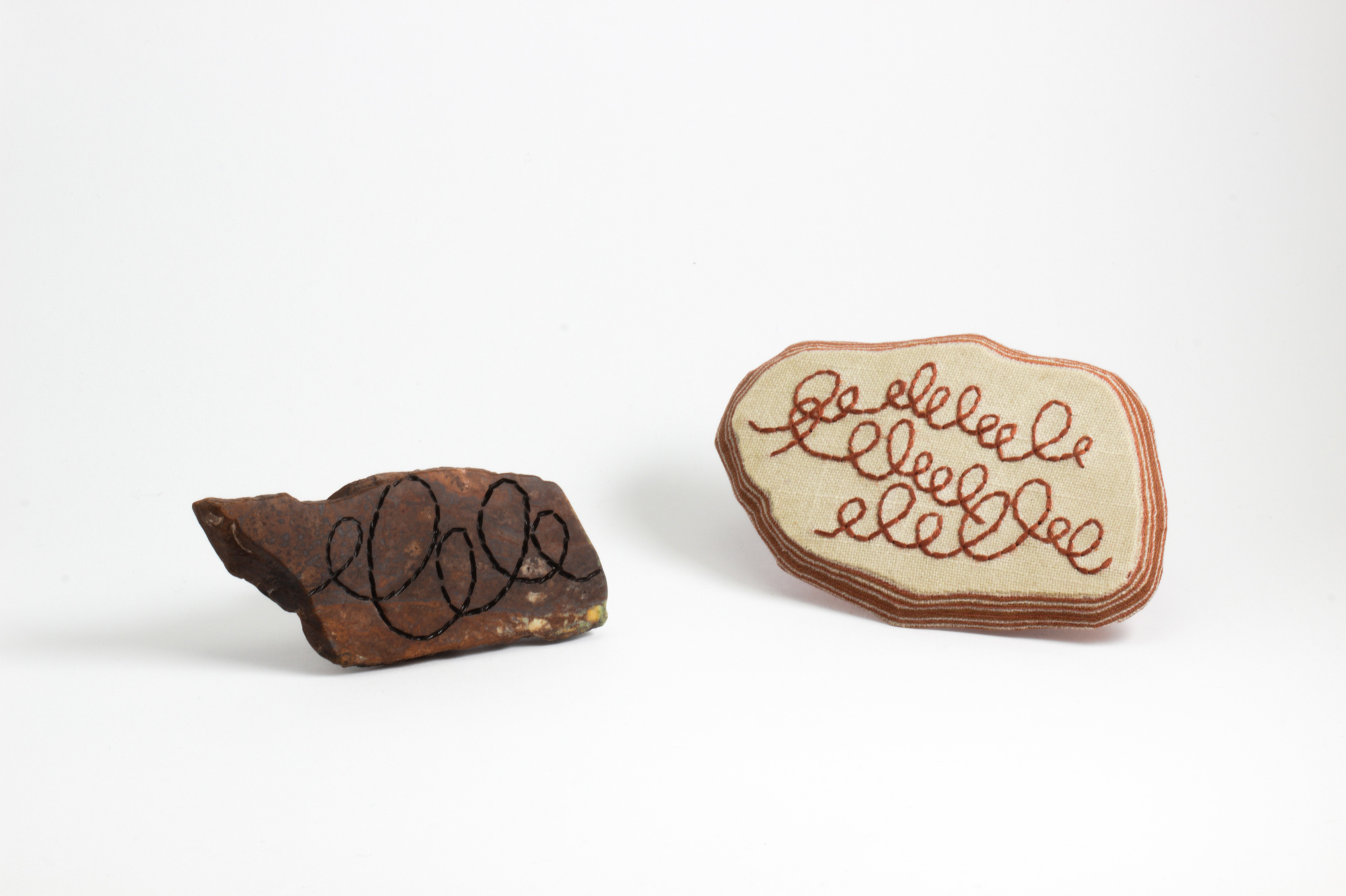 Grace Yu-Piper, Stone #2 and Stitch #2, stone, paint, fabric, thread, sterling silver, stainless steel, 80 x 35 x 15 mm and 100 x 65 x 11 mm