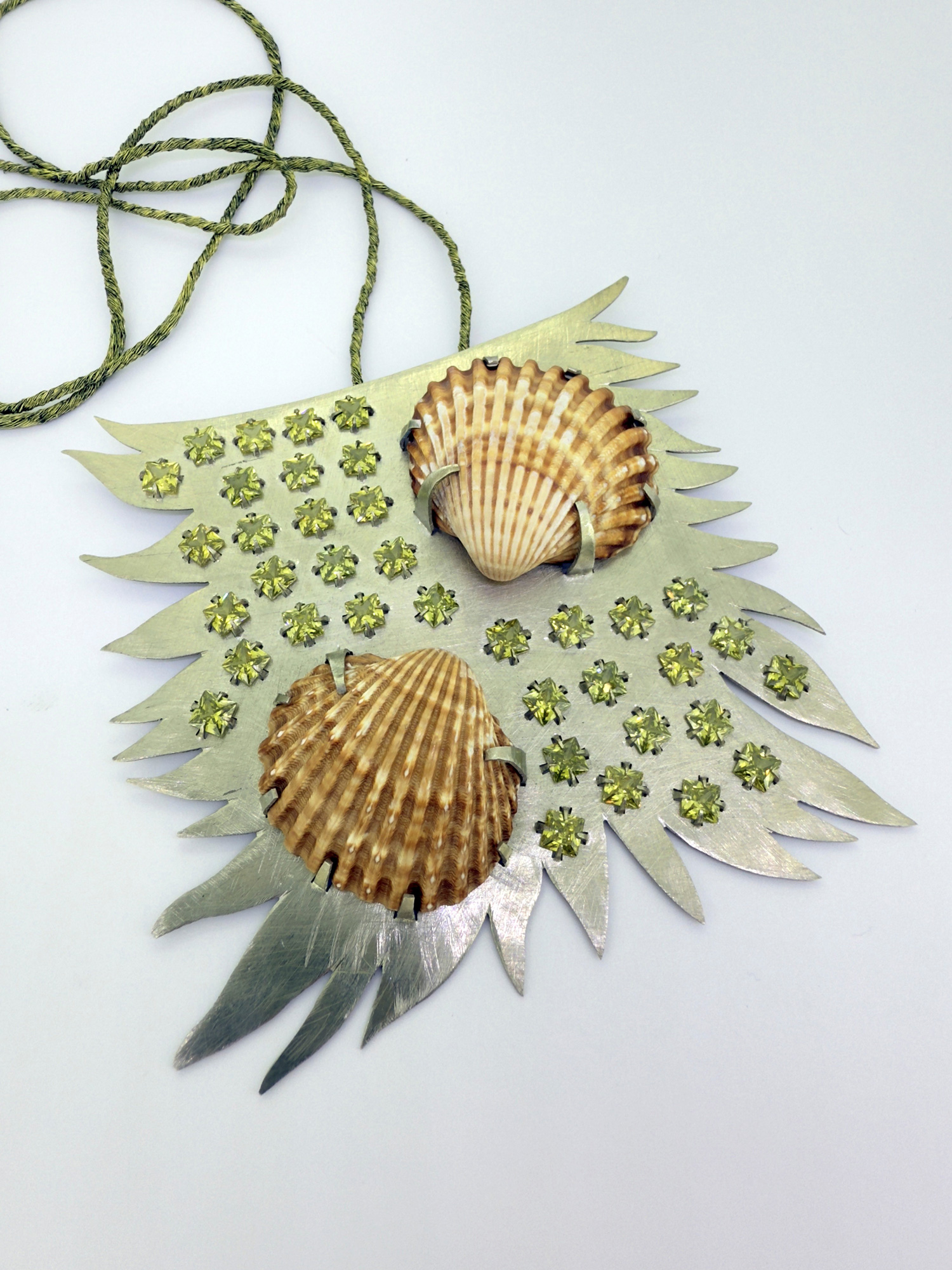 Moniek Schrijer, cutouts, 2025, pendant no.2, cupronickel (nickel silver), cubic zirconia, zeeland cockle shells, metal mesh cord, Image COTA